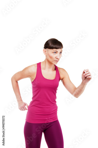 Young running woman in fitness outfit, running to aside. Isolate