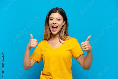 Young Russian girl isolated on blue background giving a thumbs up gesture