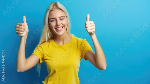 Young Russian girl isolated on blue background giving a thumbs up gesture