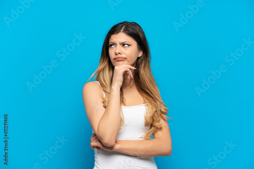 Young Russian girl isolated on blue background having doubts and thinking