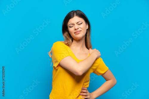 Young Russian girl isolated on blue background suffering from pain in shoulder for having made an effort