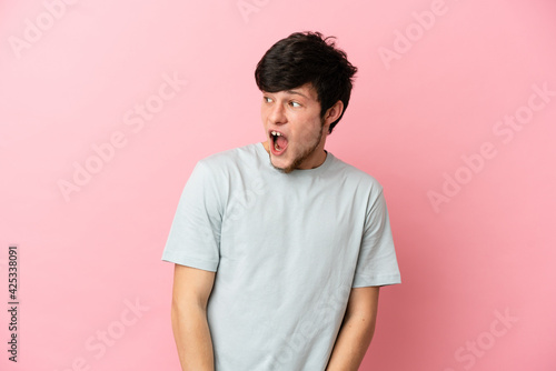 Young Russian man isolated on pink background doing surprise gesture while looking to the side