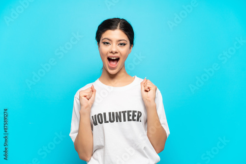 Young Russian volunteer girl isolated on blue background celebrating a victory in winner position
