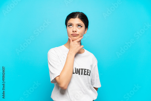 Young Russian volunteer girl isolated on blue background looking up while smiling