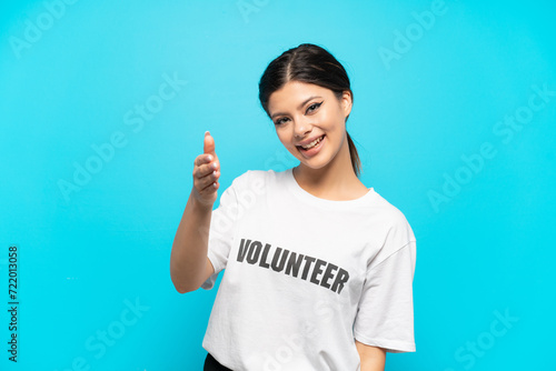 Young Russian volunteer girl isolated on blue background shaking hands for closing a good deal