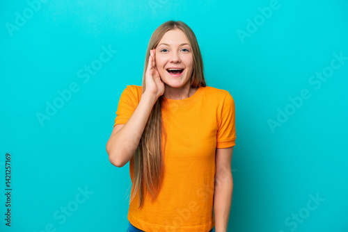 Young Russian woman isolated on blue background with surprise and shocked facial expression