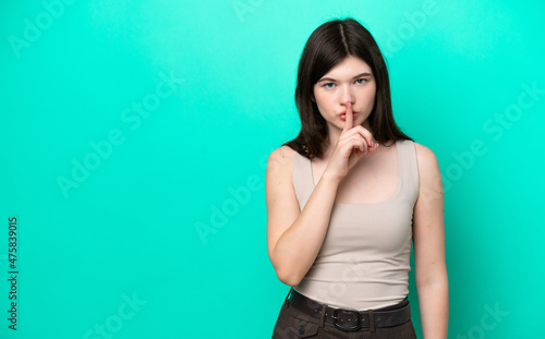 Young Russian woman isolated on green background showing a sign of silence gesture putting finger in mouth
