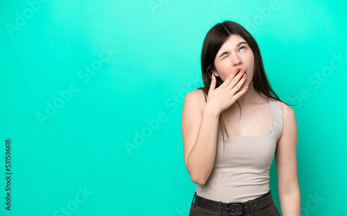 Young Russian woman isolated on green background yawning and covering wide open mouth with hand