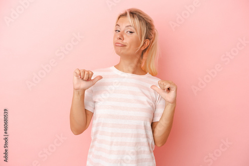 Young Russian woman isolated on pink background feels proud and self confident, example to follow.