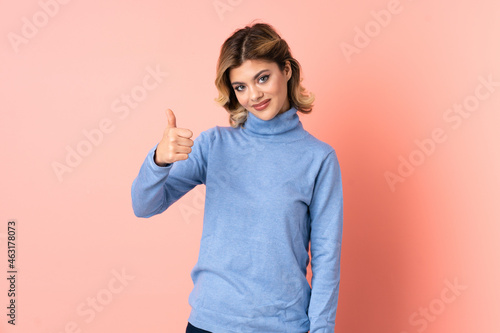 Young Russian woman isolated on pink background giving a thumbs up gesture