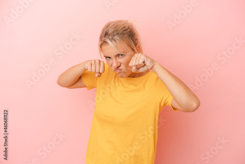 Young Russian woman isolated on pink background throwing a punch, anger, fighting due to an argument, boxing.