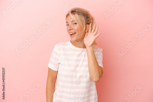 Young Russian woman isolated on pink background trying to listening a gossip.