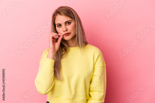 Young russian woman isolated on pink background with fingers on lips keeping a secret.