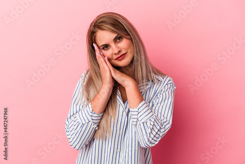 Young russian woman isolated on pink background yawning showing a tired gesture covering mouth with hand.
