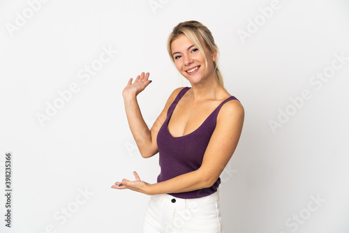 Young Russian woman isolated on white background extending hands to the side for inviting to come