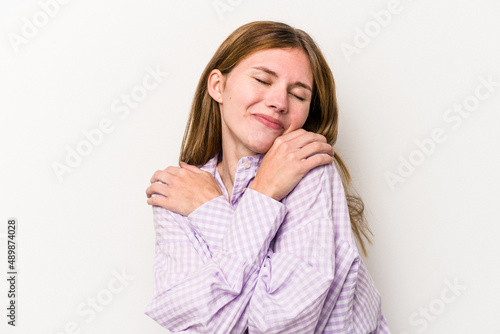 Young russian woman isolated on white background hugs, smiling carefree and happy.