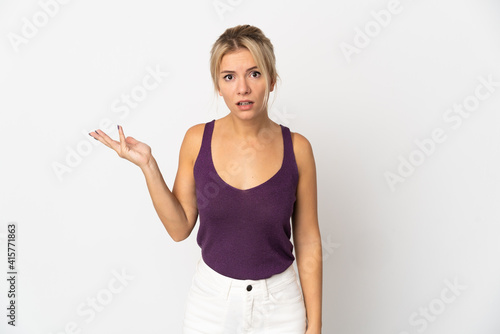 Young Russian woman isolated on white background making doubts gesture
