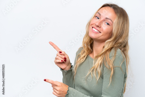 Young Russian woman isolated on white background pointing finger to the side and presenting a product