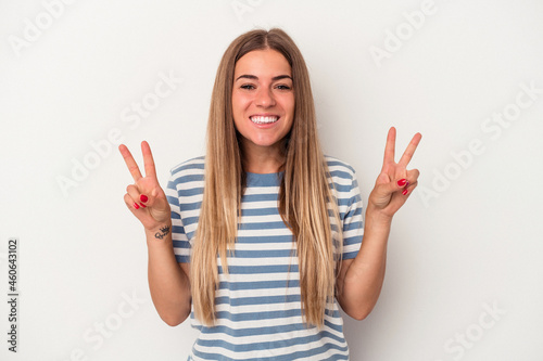 Young Russian woman isolated on white background smiles, pointing fingers at mouth.