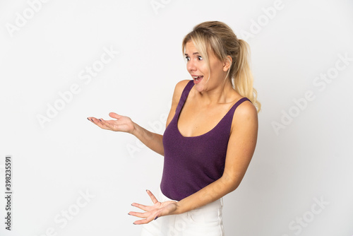 Young Russian woman isolated on white background with surprise expression while looking side