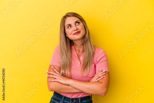 Young russian woman isolated on yellow background dreaming of achieving goals and purposes