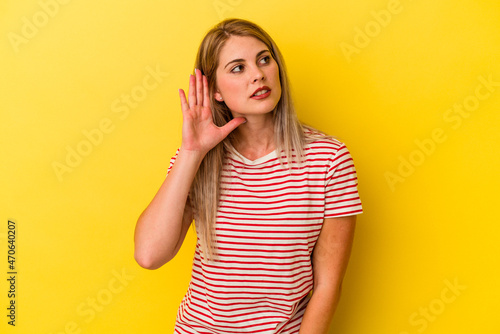 Young russian woman isolated on yellow background trying to listening a gossip.
