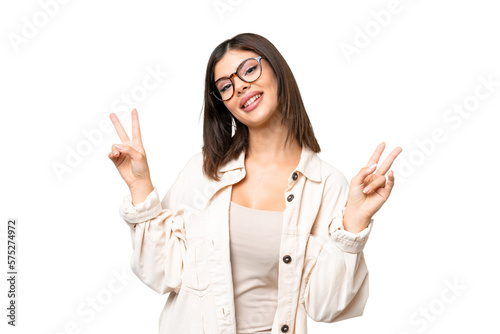 Young Russian woman over isolated chroma key background showing victory sign with both hands