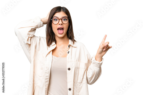 Young Russian woman over isolated chroma key background surprised and pointing finger to the side
