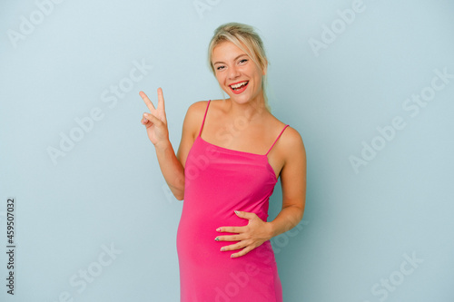 Young Russian woman pregnant isolated on blue background joyful and carefree showing a peace symbol with fingers.