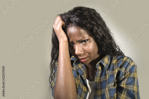 young sad and depressed black African American woman crying anxious and overwhelmed feeling sick and stressed isolated on studio background suffering depression