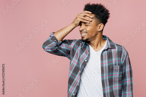 Young sad man of African American ethnicity 20s he wear blue shirt put hand on face facepalm epic fail mistaken omg gesture isolated on plain pastel light pink background studio Tattoo translate fun.