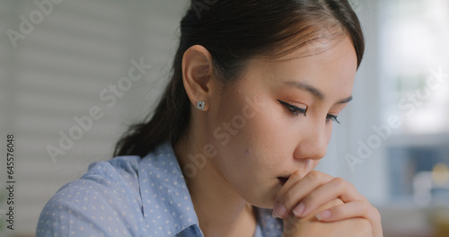 Young sad shock job lost woman worry upset tired read office bad news cruel mail reduce staff by unfair lay off break cancel stop work at home. Labor workforce crisis in asia worker people SME issue.