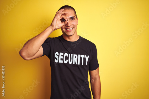 Young safeguard man with security t-shirt over yellow isolated background with happy face smiling doing ok sign with hand on eye looking through fingers