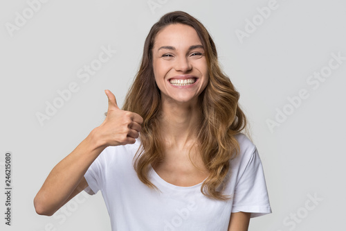 Young satisfied woman smiling with white teeth showing thumbs up looking at camera isolated on studio blank background, happy girl student like recommend dental orthodontic service concept, portrait