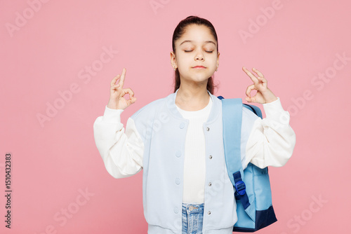 Young school girl 8-9 years old wear blue casual clothes backpack hold hands in yoga om aum gesture relax meditate isolated on plain pink background children portrait Childhood kids education concept