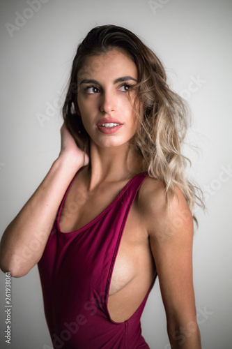 Young, sexy and seductive girl in erotic purple lingerie posing in studio.