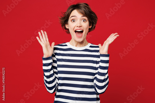 Young shocked overjoyed excited surprised happy woman she wear blue striped sweatshirt casual clothes looking camera spread hands isolated on plain red background studio portrait. Lifestyle concept.