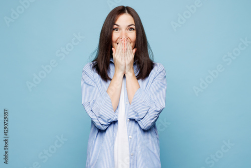 Young shocked surprised happy Caucasian woman she wears shirt casual clothes cover mouth with hand look camera isolated on plain pastel light blue cyan background studio portrait. Lifestyle concept.