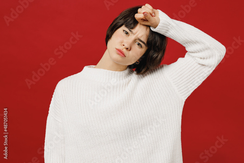 Young sick ill sad tired exhausted woman 20s wearing white knitted sweater put hand on forehead suffer from headache isolated on plain red color background studio portrait. People lifestyle concept.