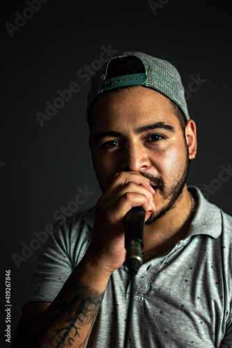Young singer with microphone recording song in studio