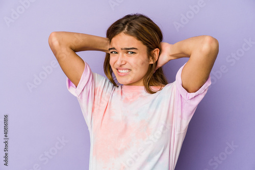 Young skinny caucasian girl teenager on purple background touching back of head, thinking and making a choice.