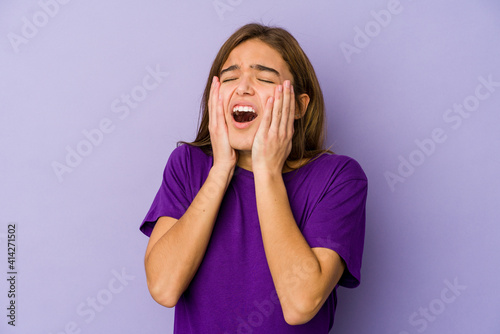 Young skinny caucasian girl teenager on purple background whining and crying disconsolately.