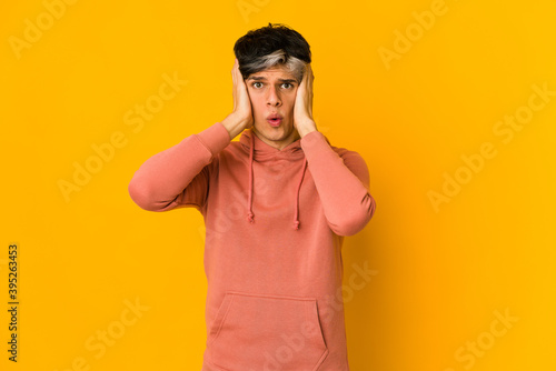 Young skinny hispanic man covering ears with hands trying not to hear too loud sound.
