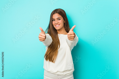 Young slim woman with thumbs ups, cheers about something, support and respect concept.