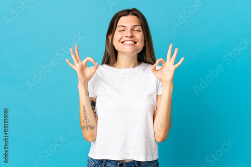 Young slovak woman isolated on blue background in zen pose