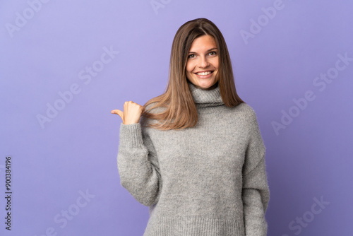 Young Slovak woman isolated on purple background pointing to the side to present a product