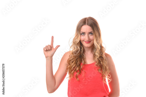 Young smiling blonde woman counting with fingers
