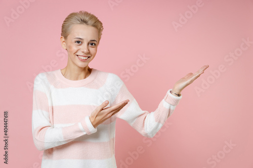 Young smiling blonde woman short haircut dental braces in casual knitted sweater point index hands aside on copy space area workspace look camera isolated on pastel pink background studio portrait.