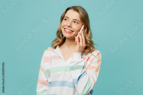 Young smiling blonde woman wear striped hoody talk speak on mobile cell phone conducting pleasant conversation isolated on plain pastel light blue cyan background studio portrait. Lifestyle concept.