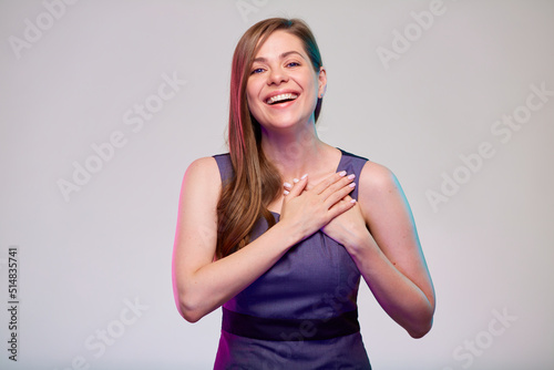 Young smiling business woman holding hand on chest. isolated portrait on grey.